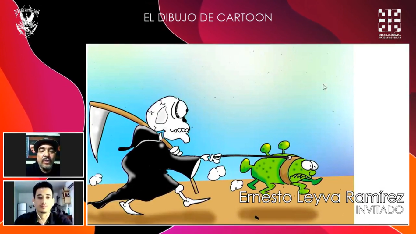 “El principal objetivo de la caricatura es que debe hablar por sí sola, es comunicación, darte a entender con pocos elementos lo que quieres decir, te dice, te satiriza, te puede ayudar por ejemplo a lograr un cometido”, manifestó el creador al participar en el programa con el que la Escuela de Artes contribuye a la agenda cultural de la Coordinación General de Extensión de la Cultura.
