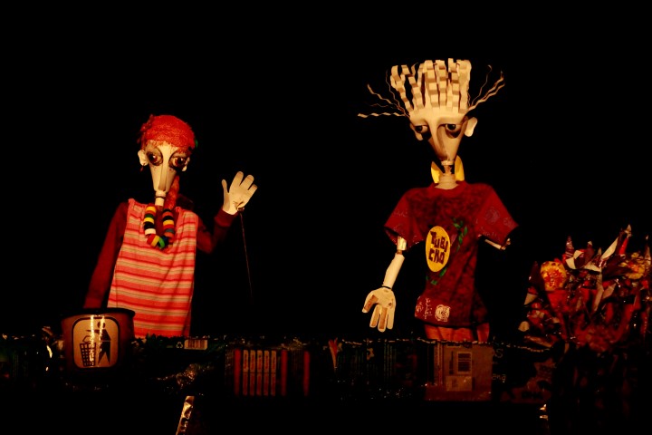 El final del espectáculo fue marcado con la actuación de un par de jovencillos, esto es, dos muñecos punketos, pero bailando al ritmo del Hip Hop, títeres elaborados a partir de deshechos de basura (con la cabeza de recipientes de plástico), que justo eso significa el nombre del grupo: Los Sakados del Tacho, es decir, “sacados del tambo de la basura”, concluyendo en una lección de reciclado para hacer más limpio el mundo, las calles, los mares y las ciudades.