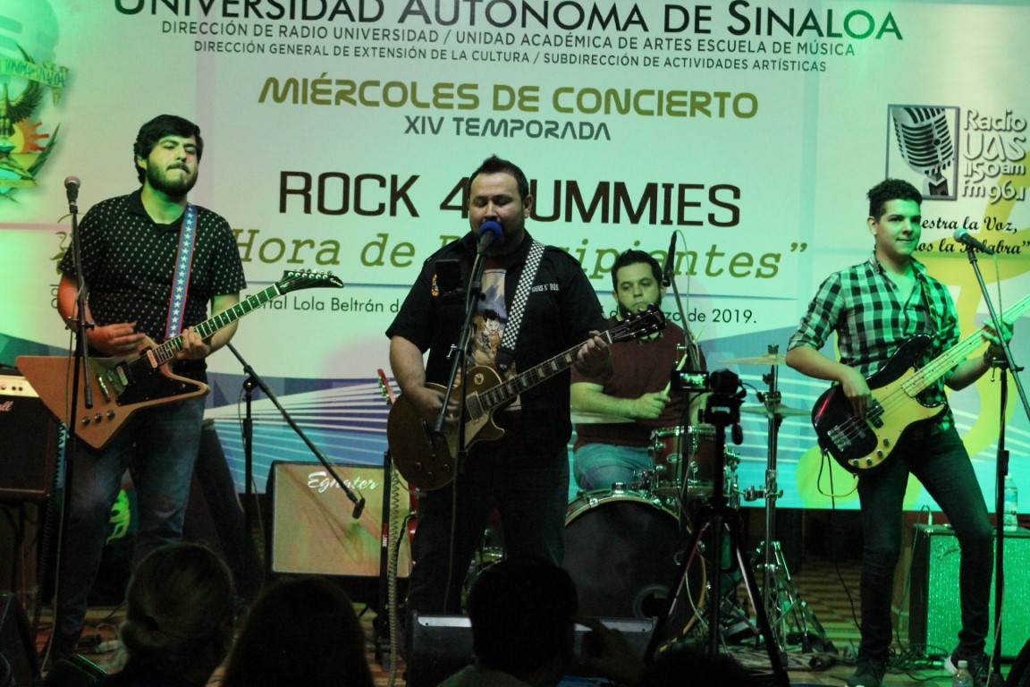 Con un tema del rock alternativo norteamericano, seguido por otro de factura británica, abrió su participación el grupo Rock Four Dummies en los Miércoles de Concierto de la UAS, haciéndose oír en el Portal Lola Beltrán de Radio Universidad, frente a un público que festejó el repertorio y que estuvo tarareando las letras de las canciones, interpretadas en inglés.