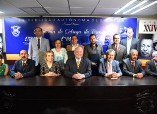 Autoridades univesitarias otorgan los premios "Óscar Liera" "Juan Eulogio Guerra Aguiluz" y "Élmer Mendoza" en acto formal en la Torre Académica.