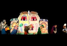 Con niños y maestras en papel de titiriteros, bailando...
